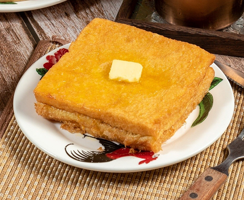 金黃腐皮包裹著彈牙蝦仁、花枝漿及脆口韭黃、馬蹄丁等餡料後,送進180度油溫,待腐皮膨脹,開始酥化,油溫多一點、少一點都不行。